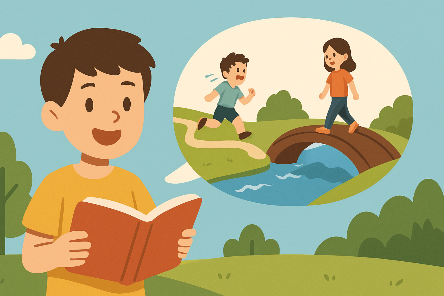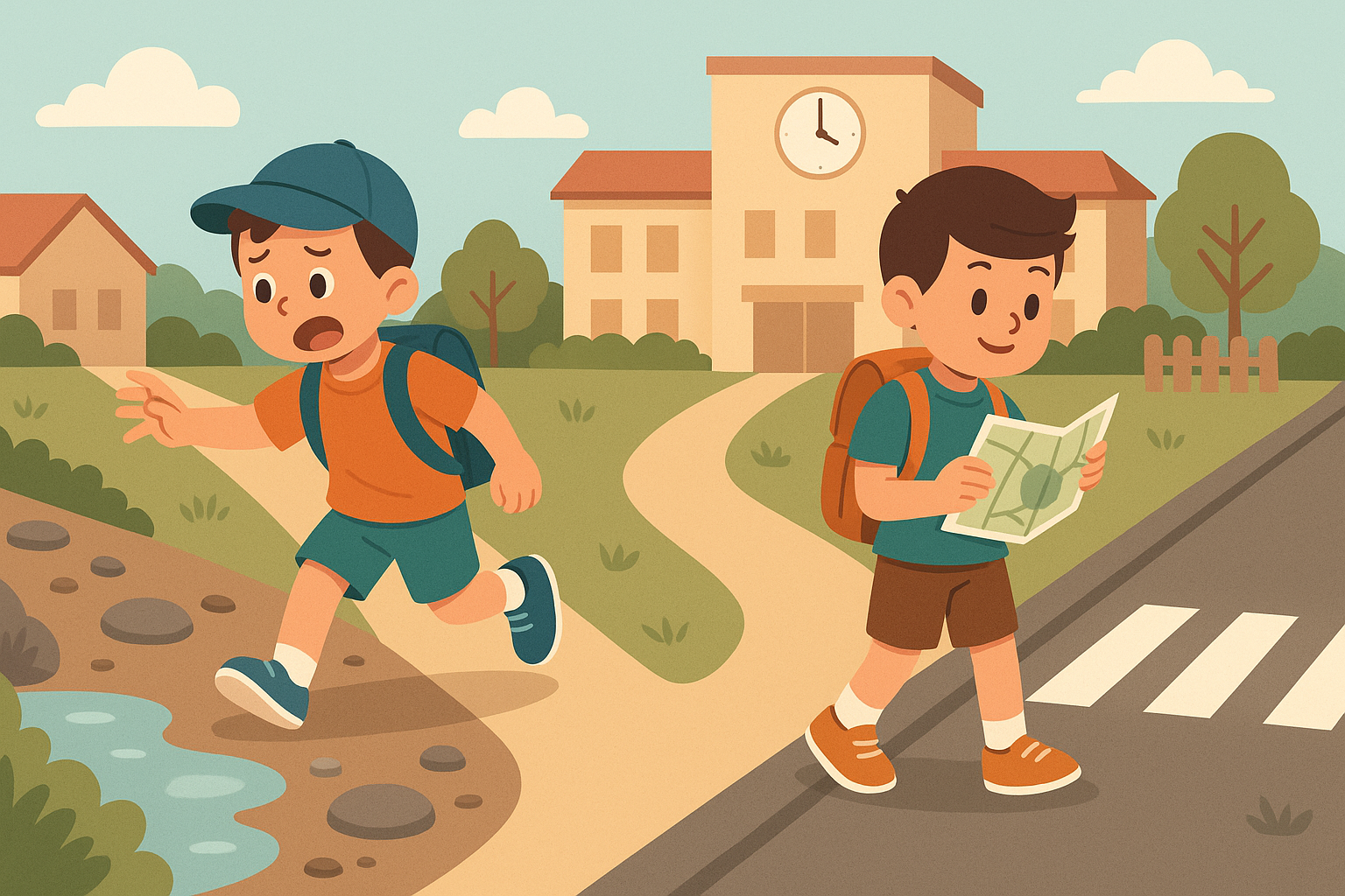 たとえば、「近道を行く人が川に落ちる」「遠回りして橋を渡る人が無事に進む」といったイラストで理解を深めましょう。
